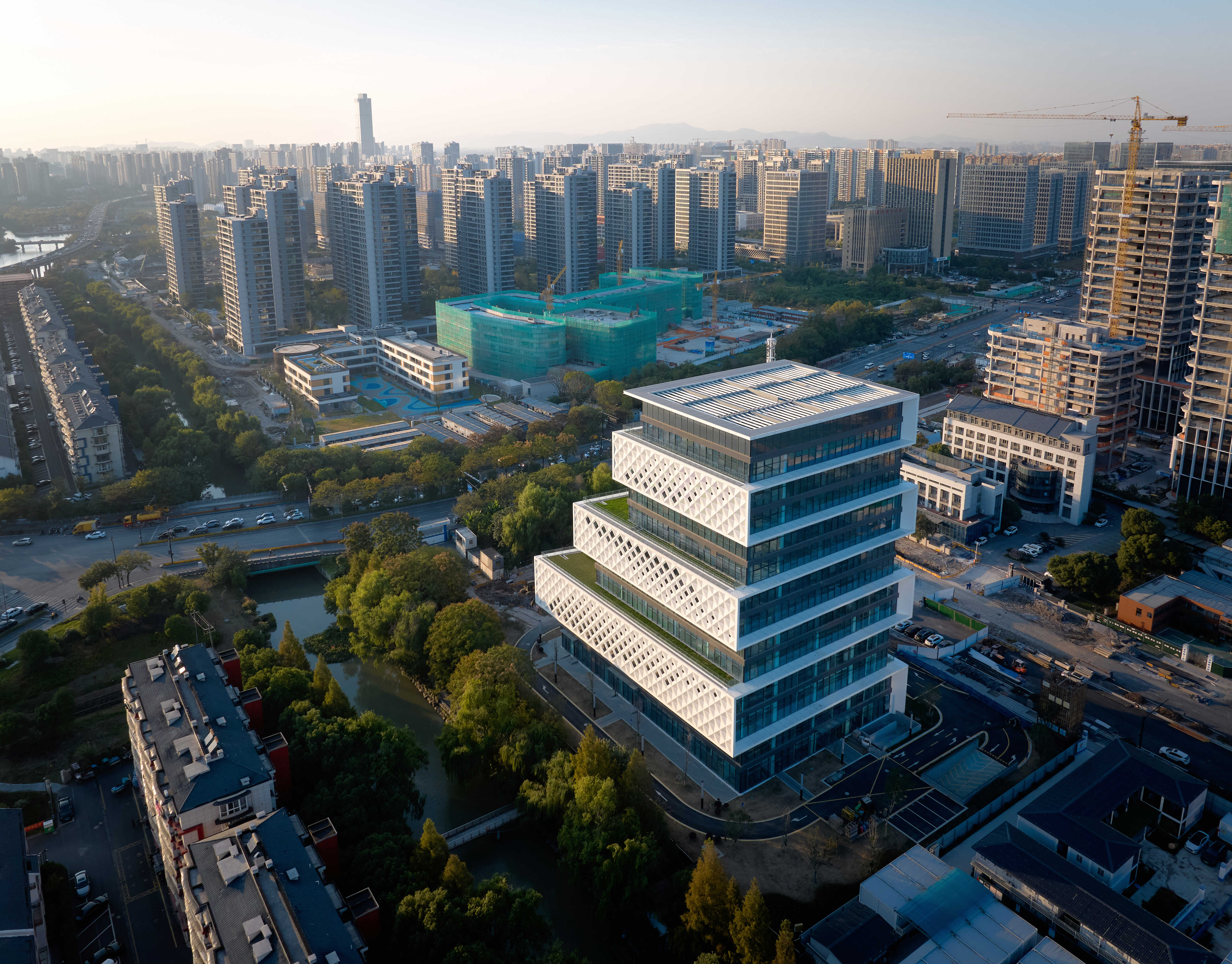 項(xiàng)目以“折疊森林”為設(shè)計(jì)理念,以”折疊生長(zhǎng)"的形態(tài)實(shí)現(xiàn)建筑與自然的有機(jī)融合。建筑每?jī)蓪訛橐粋€(gè)單位,仿佛由一張紙張折疊成塊,從地面生長(zhǎng)至天空,形成建筑的基本形體。建筑折疊的實(shí)體部分采用白色穿孔鋁板其余部分采用灰色玻璃或鋁板,通過(guò)強(qiáng)烈的虛實(shí)對(duì)比,形成有張有弛的建筑造型效果。未來(lái)感科技感的獨(dú)特造型,呼應(yīng)場(chǎng)所精神形成立體空中花園;兼具功能與美感的雙層表皮細(xì)節(jié)構(gòu)造,既滿足功能需求,又帶來(lái)豐富的光影效果;內(nèi)外統(tǒng)一的四層通高共享中庭,與退臺(tái)花園滲透融合;光伏玻璃、空中花園、被動(dòng)遮陽(yáng)等材料技術(shù)的運(yùn)用,降低建筑能耗、打造了高品質(zhì)的綠色建筑。