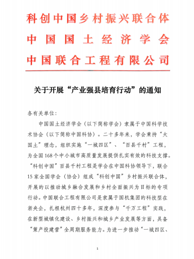 近日,“科創中國”鄉村振興聯合體、中國國土經濟學會、中國聯合工程有限公司聯合印發《關于開展“產業強縣培育行動”的通知》(以下簡稱《通知》),擬攜手相關單位共同推動“產業強縣培育行動”相關工作。